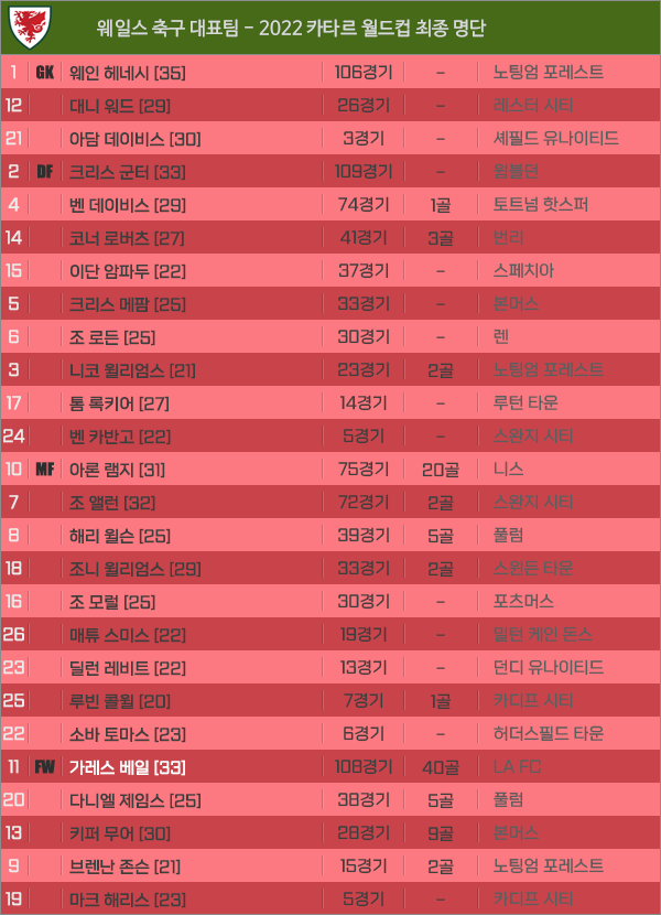 [피파] 웨일스 - 2022 카타르 월드컵 최종명단