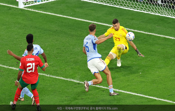 스페인은 7일[한국시간] 카타르의 알 라이얀에 위치한 에듀케이션 시티 스타디움에서 열린 2022 FIFA 월드컵 16강전에서 모로코와 득점 없이 비겼다. 연장전을 포함한 120분 동안의 결과다. 지루했던 두 팀의 경기는 승부차기에서 결정이 났고, 스페인이 0-3으로 졌다. 이로써 스페인은 두 대회 연속 16강에서 승부차기로 패배하는 진기록을 남겼다.